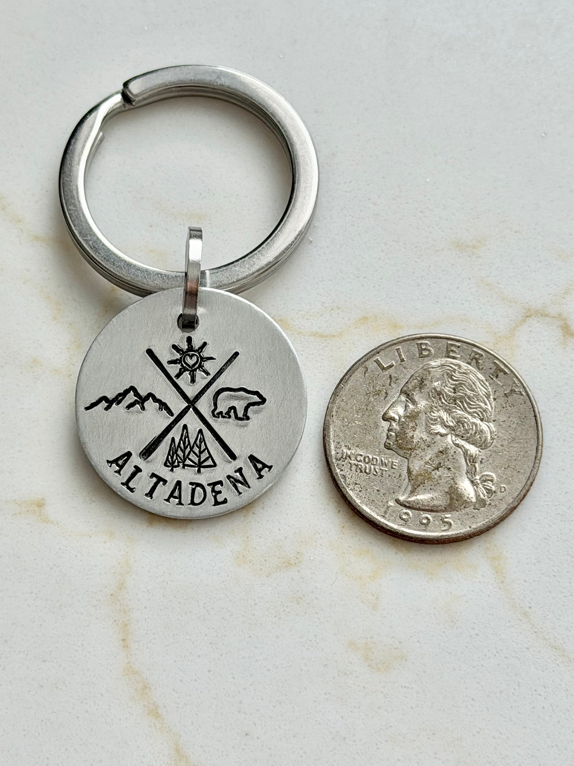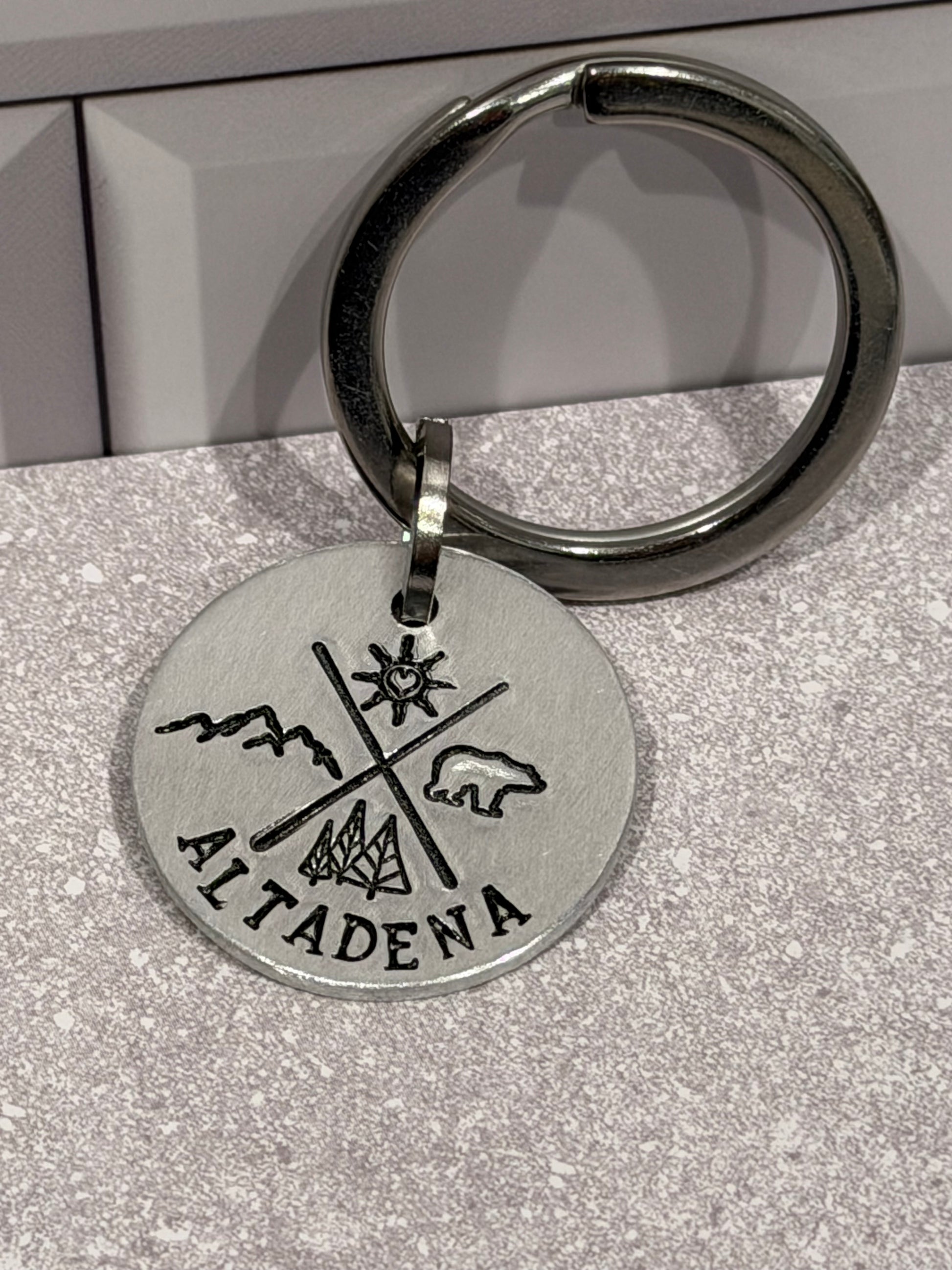 This hand stamped keychain features “Altadena” stamped along the bottom with a cross design showcasing the symbols of our foothill community: a bear, a heart sun, the mountains, and the trees. It is stamped on a 1-inch, 14-gauge aluminum disc attached to stainless steel hardware.