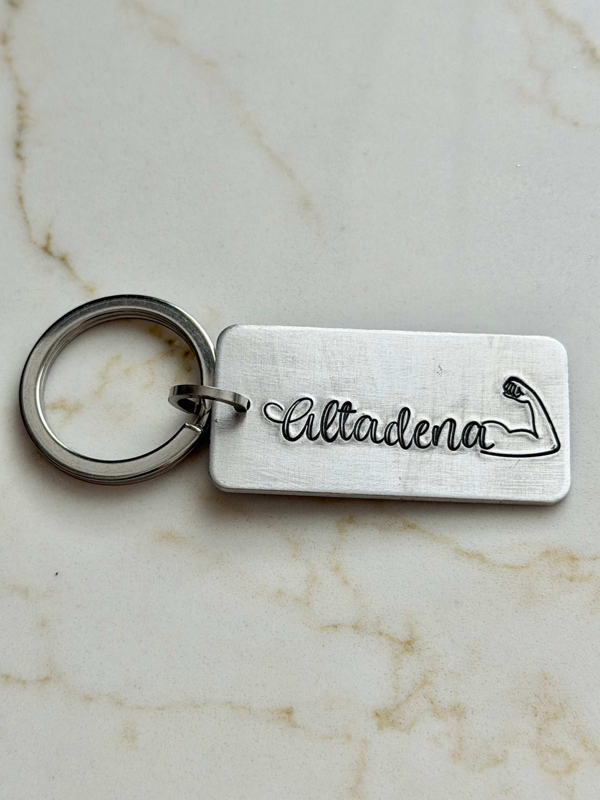 A small reminder of the strength it takes to call this place home. This 2" x 1" hand-stamped aluminum keychain features “Altadena” with a flexing arm symbol at the end, creating a simple but powerful nod to resilience and community. Lightweight, durable, and made to carry every day.