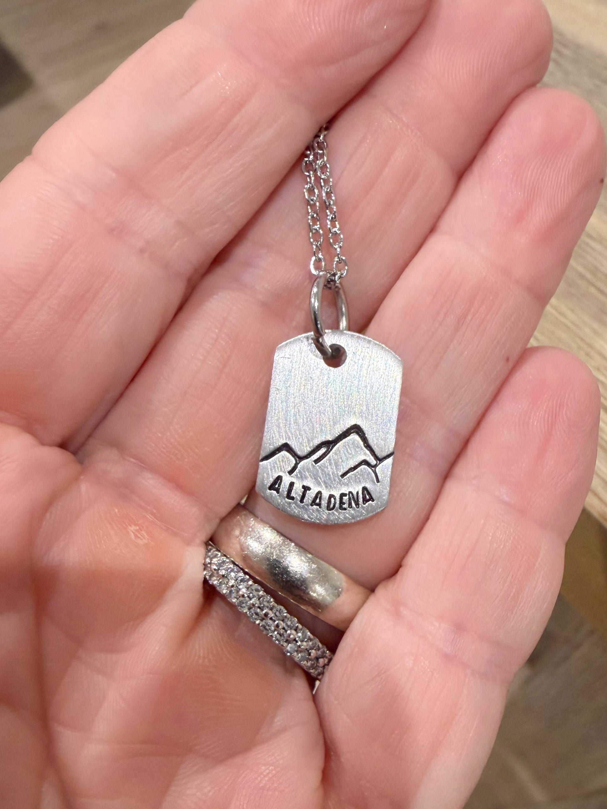 This tiny brushed-pewter dog tag measures 1/2 x 3/4 inch and is hand stamped with ALTADENA along the bottom edgge in a delicate 1.5 mm block font, paired with a simple mountain silhouette. Each tag is crafted one at a time, giving every necklace a slightly unique character.